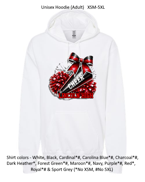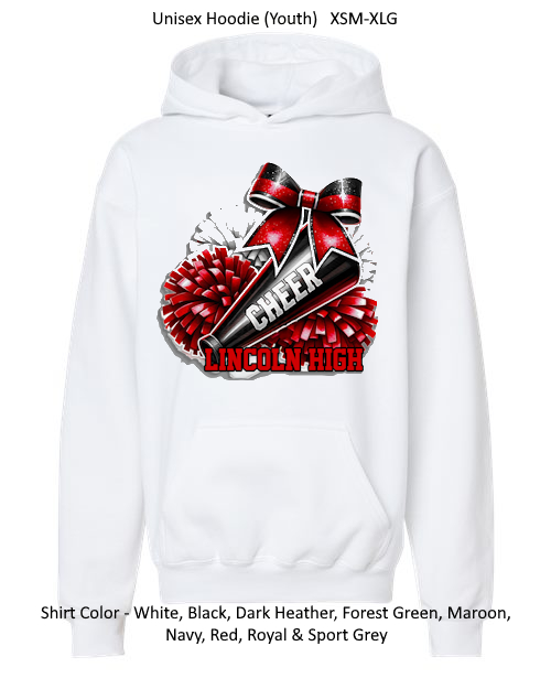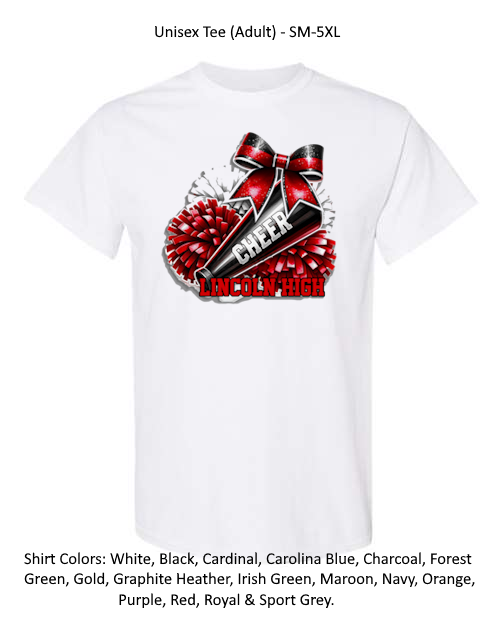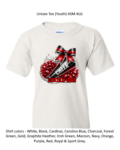 Please allow 2 WEEKS production time for CUSTOM garments (garments with School names or garment colors other than white or black) and 1 WEEK or less production time for NON-CUSTOM garments (garment colors of white and black with no school name).